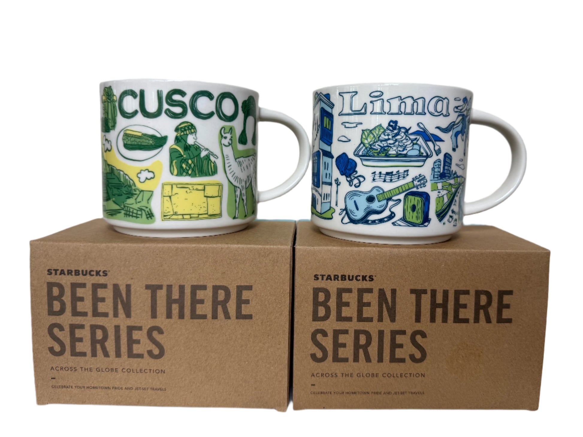 Celebra la cultura peruana con este set coleccionable de tazas Starbucks Been There Series con diseños de Cusco y Lima. Cada taza de cerámica de 14 oz presenta ilustraciones icónicas inspiradas en la historia y paisajes del Perú. Ideal para coleccionistas o como regalo especial — nuevo en caja.